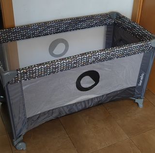 Cuna de viaje Lionelo Stefi en color gris, con un diseño moderno y práctico. - Apertura lateral para facilitar el acceso. - Incluye bolsa de transporte. - Estructura plegable para un fácil almacenamiento.