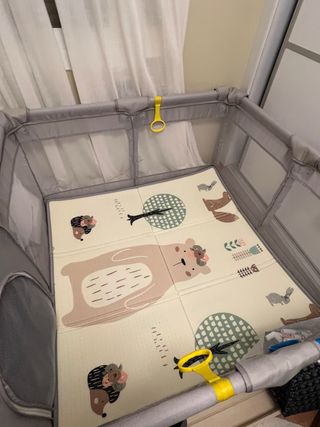 Parque infantil con un diseño moderno y divertido, ideal para los más pequeños. Incluye una alfombra de juegos con motivos de animales y árboles. - Estructura de tela y metal. - Alfombra de juegos con estampado. - Dos asas de seguridad amarillas.