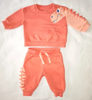 Conjunto de chándal para bebé con diseño de dinosaurio. - Color coral. - Sudadera con bolsillo canguro y detalles de dinosaurio en la manga. - Pantalón con cordón ajustable y detalles de dinosaurio en la pierna. - Talla 62cm.