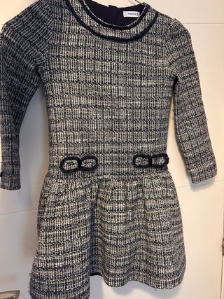 Vestido infantil de la marca Mayoral con un diseño tejido. - Tejido tipo tweed en tonos azul marino y blanco. - Detalle de lazos en la cintura. - Mangas largas. - Cuello redondo con ribete.