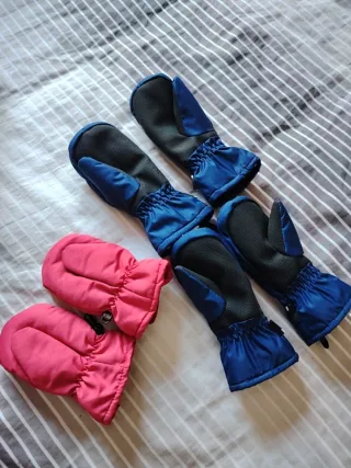 Conjunto de manoplas de invierno para niños. Son cómodas y cálidas. - Tres pares de manoplas. - Color: 2 azules y 1 rojas. - Talla para 3 a 9 años aprox.
