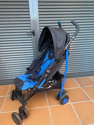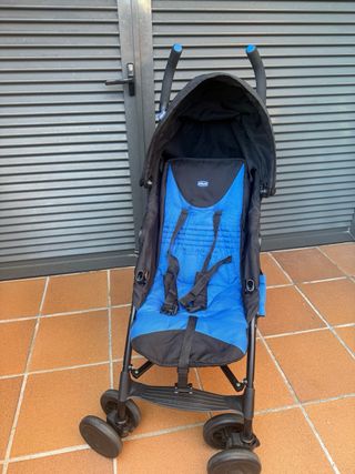 Silla de paseo Chicco en color azul y negro. Compacta y ligera para facilitar su transporte. De 0 a 22kg. - Capota. - Arnés de seguridad. - Ruedas delanteras giratorias. - Cesta de almacenamiento. - Plástico para la lluvia Sin envío. Recoger en Vilassar de dalt.