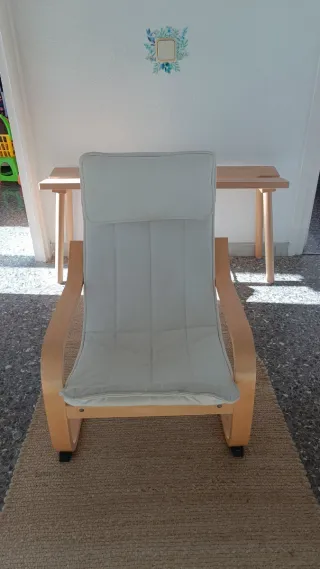 Sillón mecedora infantil de la marca IKEA, perfecto para los más pequeños. - Estructura de madera clara. - Cojín blanco acolchado (necesita un lavado)
