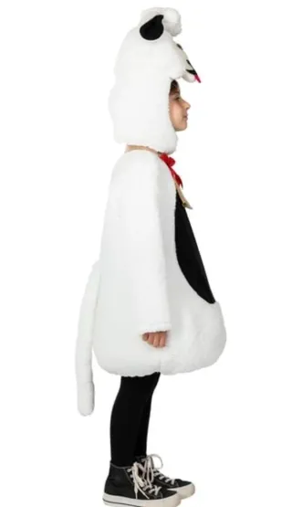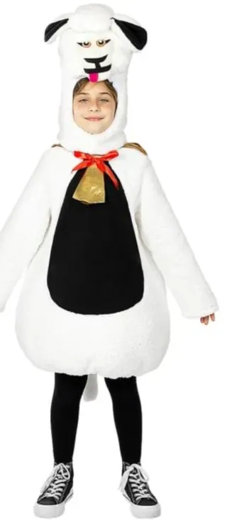 Disfraz de oveja para niño, perfecto para fiestas o carnaval. Tenemos dos de adultos y uno de niño. - Mono blanco con barriga negra. - Capucha con cara de oveja y orejas. - Incluye cascabel dorado y lazo rojo.