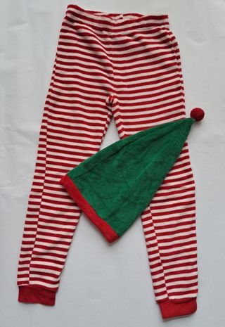 Pijama de franela con diseño de elfo. - Tres piezas: Jersey, pantalón y gorro. - Color verde. - Cuello y detalles rojos. - Cinturón negro. - Botones decorativos.