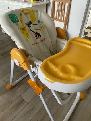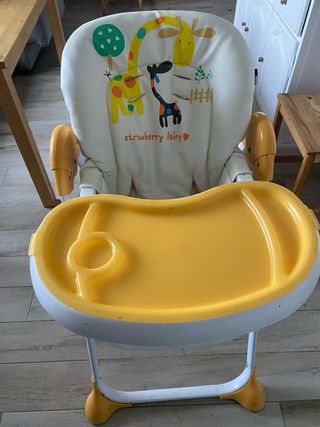 Trona para bebé con un divertido estampado de jirafas y el texto strawberry fairy. - Cojín acolchado. - Bandeja amarilla con hueco para vaso. - Estructura blanca y amarilla.
