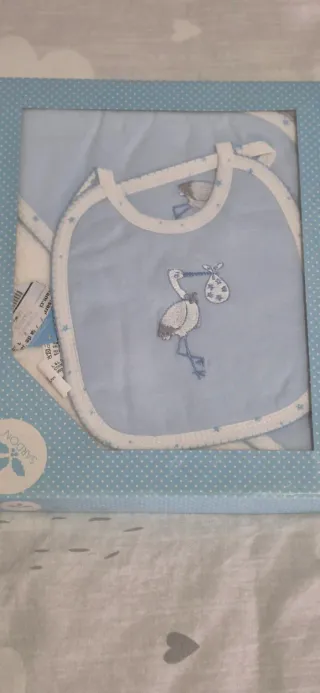 Conjunto de Sardon para bebé, ideal para los más pequeños. Incluye un babero y una capa de baño. - Diseño con cigüeña bordada. - Borde blanco con estrellas. - Color azul claro.