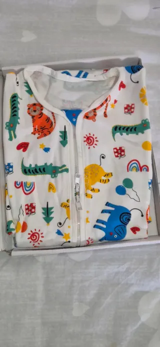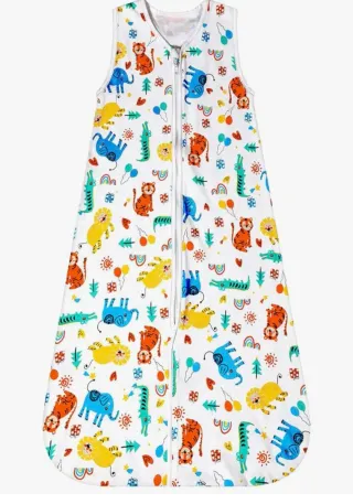 Saco de dormir para bebé con un divertido estampado de animales de la selva y arcoíris. Algodón Talla 3 a 18 meses 0.5 TOG - Diseño sin mangas. - Cierre de cremallera doble frontal. - Estampado multicolor sobre fondo blanco.