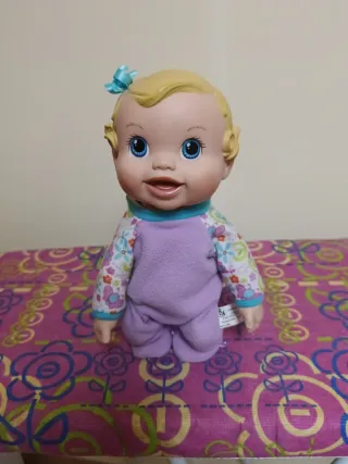 Muñeca Baby Alice, ideal para los primeros pasos.。 - Pelo rubio con coletas. - Vestido azul con estampado de perro. - Zapatos rosas.