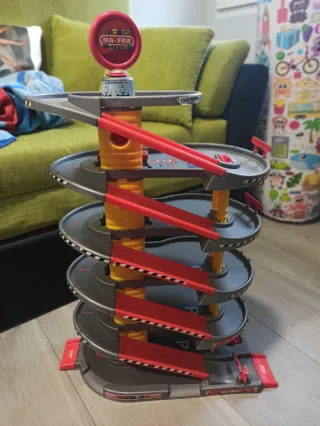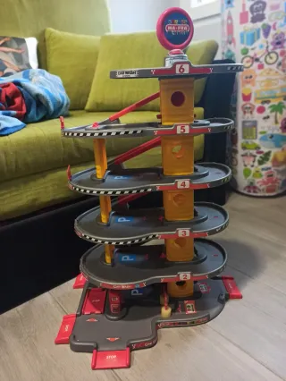 Parking de juguete para coches con varios niveles y accesorios. - Incluye señalización y rampas. - Cuenta con zona de lavado (Car Wash). - Niveles numerados del 2 al 6. - Ascensor de coches. - Incluye coches de juguete. - Tiene algunos signos de desgaste, le faltan algunas pegatinas y algun quitamiedos.