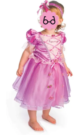 Disfraz de Rapunzel para niña, perfecto para fiestas o juegos. Talla 12/18 meses - Incluye vestido y diadema. - Diseño inspirado en el personaje. - Colores morado y rosa. Puesto para unas fotos