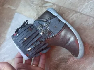 Botas para niña de la marca Garvalin, modelo Agatha Ruiz de la Prada. - Diseño con estrellas y flecos. - Color plateado y azul marino. - En perfecto estado. Solo están un poco peladas por dentro al subir la cremallera. - Talla 25.