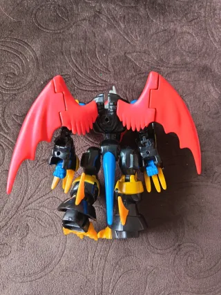 Figura de acción de un robot con diseño de pájaro. Sus colores vibrantes lo hacen destacar. - Diseño con alas rojas y detalles en amarillo y negro. - Cabeza de pájaro con pico amarillo. - Patas con garras amarillas.