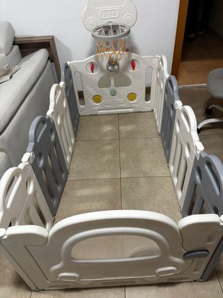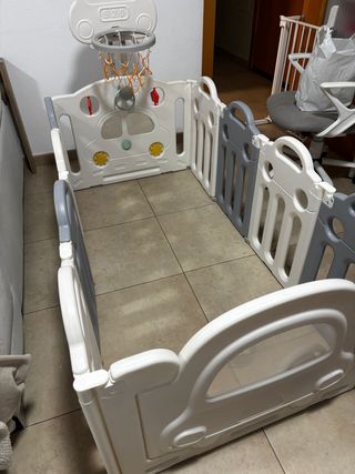 Parque infantil de gran tamaño con diseño de coche y canasta de baloncesto. - Paneles de plástico blanco y gris. - Canasta de baloncesto integrada. - Diseño con forma de coche. - Puerta de acceso. - Fácil de montar y desmontar.