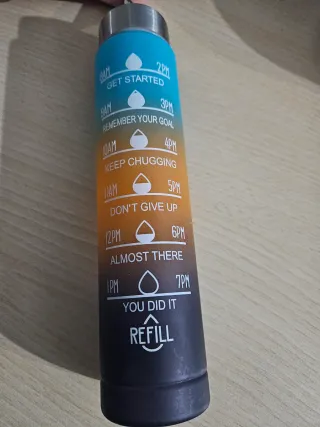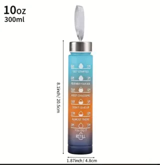 Botella de agua con diseño degradado y marcas horarias para controlar la ingesta. - Capacidad: 300ml (10oz). - Altura: 20.5cm (8.1 pulgadas). - Diámetro: 4.8cm (1.87 pulgadas). - Material: Plástico y tapa metálica.