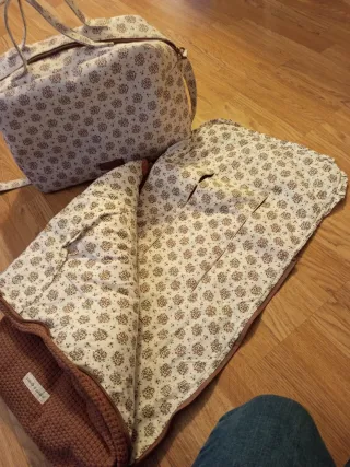 Conjunto de bolso y saco para bebé con un bonito estampado floral. - Bolso con asas y cierre de cremallera(uno de los tiradores se a descosido y caído,pero le tengo) - Saco de entretiempo con exterior de tejido texturizado. - Estampado floral en tonos marrones y blancos. -Marca pasito a pasito -Esta en perfecto estado. NO NEGOCIABLE. ME COSTÓ MAS DE 150€