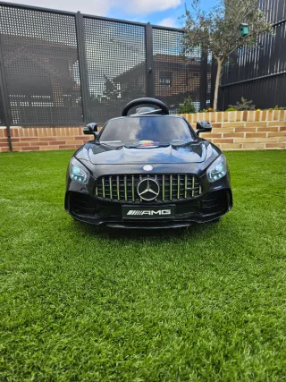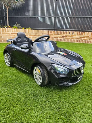 Coche eléctrico a batería con licencia oficial Mercedes-Benz SLS AMG GT R en color negro. El coche tiene muy poco uso (como 10 veces) y tiene luces, claxon, las puertas se abren y radio, ranura pen drive, etc. Se puede conducir desde dentro del coche y desde el mando inalambrico. Tiene 3 velocidades hacia delante y marcha atrás. - Diseño deportivo. - Asiento ergonómico. - Volante. - Ruedas con detalles plateados. - Espejos retrovisores.