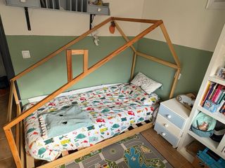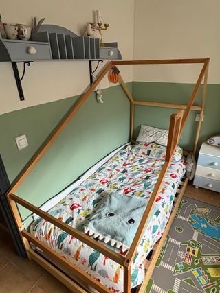 Cama infantil con diseño de tipi, ideal para habitaciones de niños. - Estructura de madera y detalles en blanco. - Incluye colchón(sin uso) - Base de cama con cajón. El cajon blanco se puede quitar y queda pegada al suelo. Esta sin usar. Los unicos desgastes son de apoyar alguna percha.