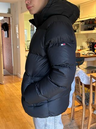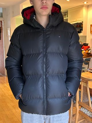 Abrigo plumas negro con capucha de Tommy Hilfiguer para niño de 1,65 a 1,75, en perfectas condiciones lo compré hace unos meses pero no es el estilo de mi hijo,
