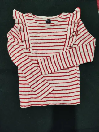 Pack de tres camisetas de manga larga para niña. Se encuentran en buen estado. - Diseño a rayas rojas y blancas. - Cuello redondo. - Volantes en los hombros.