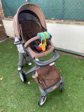 Carro Stokke en buen estado, ideal para paseos. - Color marrón. - Incluye accesorios. - Diseño moderno y funcional.