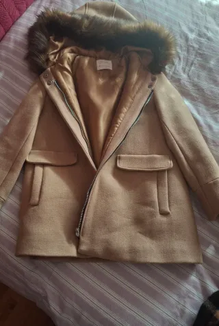 Abrigo tipo parka de Zara para niña, talla 13-14 años. Ideal para el frío. - Color camel. - Capucha con pelo sintético. - Cierre de cremallera. - Bolsillos delanteros.