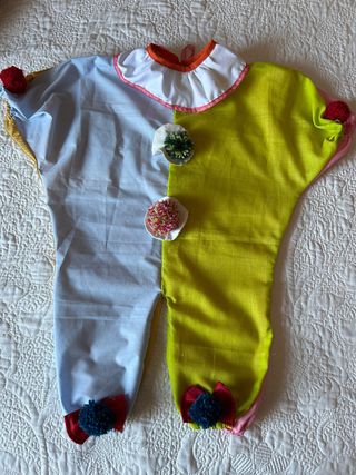 . Disfraz de arlequín de cuatro colores para bebé de entre 6 y 9 meses. Colores verde, celeste, rosa y amarillo . Pompones decorativos. Medidas talle 40, largo total 60. Anchura cuerpo 38. Hecho nuevo .