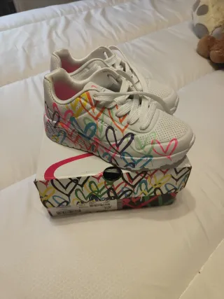 Zapatillas de niña con un diseño alegre y colorido de corazones, número 29 - Exterior blanco con estampado de corazones en varios colores. - Cierre de cordones. - Detalle interior en color rosa.