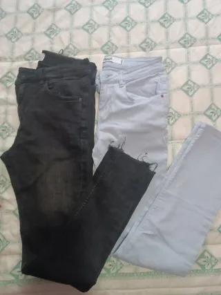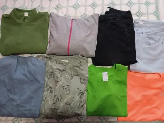 Lote de 8 prendas de ropa para niña de 12 años, hasta 158cm. - Sudadera verde con cremallera. - Sudadera gris con cremallera y capucha. - Pantalones vaqueros negros con rotura en la rodilla. - Pantalones vaqueros claros. - Vestido azul tirantes. - Vestido verde con estampado. - Camiseta verde decathlon - Camiseta naranja verano. Poco uso, los vestidos están nuevos, puesto solo una vez, los vaqueros más usados.