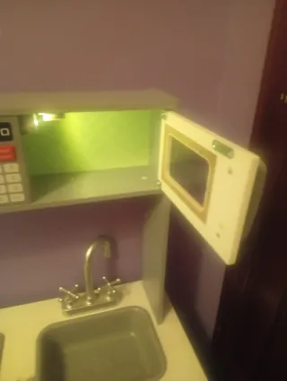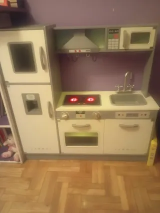 Divertida cocina de juguete para niños, con un diseño moderno y completo. - Incluye horno, microondas y fogones. - Grifo y fregadero integrados. - Estanterías y colgadores para accesorios, también incluye juego de ollas y accesorios de cocina está sin usar prácticamente nueva no se ha utilizado