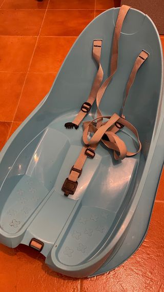 Trineo de plástico azul diseñado para los más pequeños. Incluye un sistema de arnés para mayor seguridad. - Color azul claro. - Material de plástico resistente. - Arnés de seguridad de tres puntos.