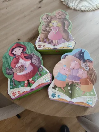 Lote de tres puzzles de la marca Djeco con ilustraciones de cuentos infantiles. - Puzzle de Los Tres Osos (324 piezas). - Puzzle de Caperucita Roja (36 piezas). - Puzzle de Los Tres Cerditos (24 piezas).