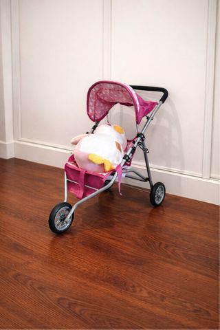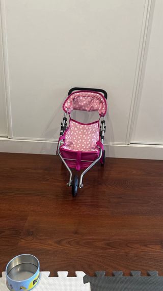Silla de paseo para muñecos, ideal para jugar. - Estructura metálica. - Capota con estampado de puntos rosas. - NO Incluye un peluche, es solo para ilustrar el tamaño de la silla. - Ruedas para facilitar el movimiento.
