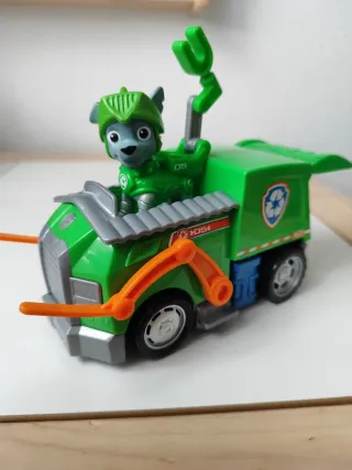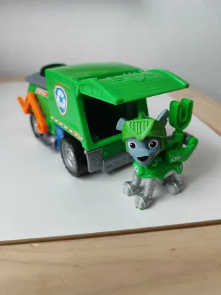 Figura de la Patrulla Canina con su vehículo. - Figura de Rocky con armadura. - Vehículo de reciclaje verde. - Brazos naranjas en la parte delantera.