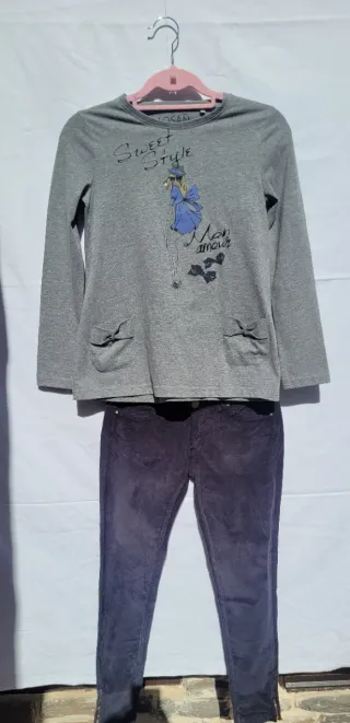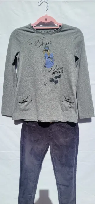 Conjunto de niña compuesto por camiseta y pantalón. - Camiseta gris con dibujo de chica y texto Sweet Style Mon Amour. - Pantalón de pana negro