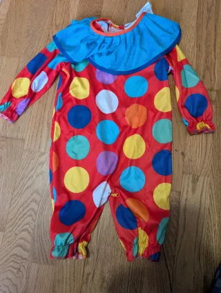 Disfraz de payaso con estampado de lunares de colores. - Talla: 6-12 meses. (58 cm de hombro a tobillo) - Disfraz cuerpo entero - Cuello volante azul.