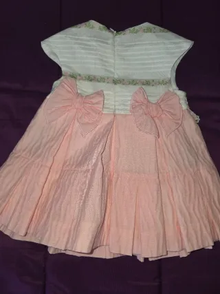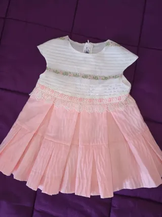 Precioso vestido para bebé de 1 a 2 años. Usado 1 dia - Parte superior blanca con detalles bordados. - Cintura con detalle floral. - Falda rosa con pliegues y encaje.