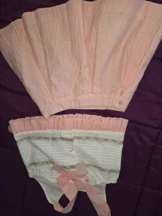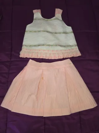 Precioso conjunto para niña de 6 a 7 años. Puesto 1 dia - Parte superior blanca con detalles florales y encaje. - Falda rosa con textura y pliegues.