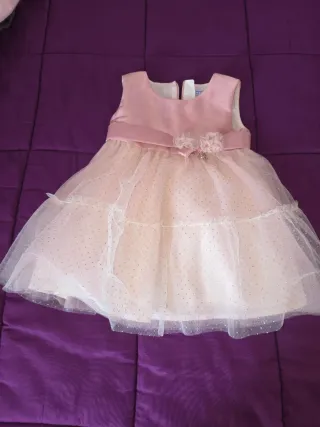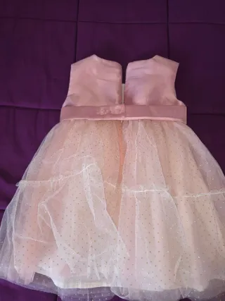 Precioso vestido para niña en talla 12/18 meses. Ideal para ocasiones especiales. - Color rosa pálido. - Tejido de tul con topos dorados. - Detalle de lazo y flor en la cintura.