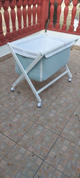 Vendo minicuna para bebé, ideal para los primeros meses. Está en muy buen estado y es perfecta para tener al bebé cerca. - Plegable y fácil de transportar. - Estructura de madera. - Tejido ligero y transpirable de color verde agua. - Incluye colchón.