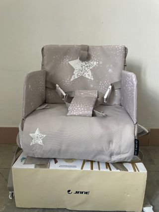 Asiento elevador para bebé de la marca Jane, diseñado para ser práctico y funcional. Se transforma fácilmente en un bolso para su transporte. - Diseño con estampado de estrellas. - Incluye cinturones de seguridad. - Color gris claro. Nuevo cuesta 50€