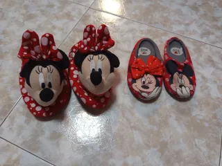 Conjunto de dos pares de zapatillas de estar por casa con diseño de Minnie Mouse. - Un par con cara 3D de Minnie y lunares rojos. - Otro par con estampado de Minnie y lazo rojo.