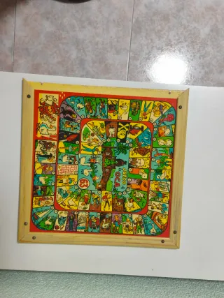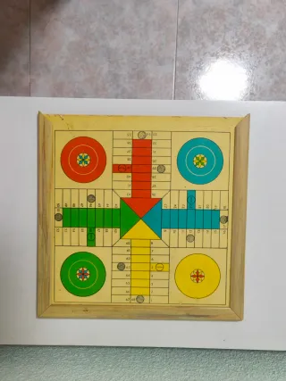 Tablero de parchís y oca vintage con un diseño clásico y colorido. Perfecto para disfrutar de partidas. - Tablero cuadrado con marco de madera. - Diseño de 4 casas de inicio (roja, azul, verde, amarilla). - Pistas numeradas para el juego.
