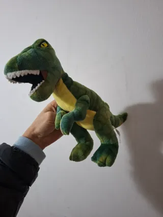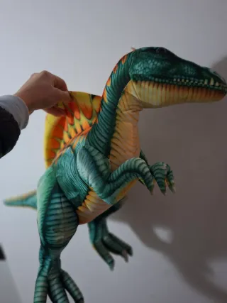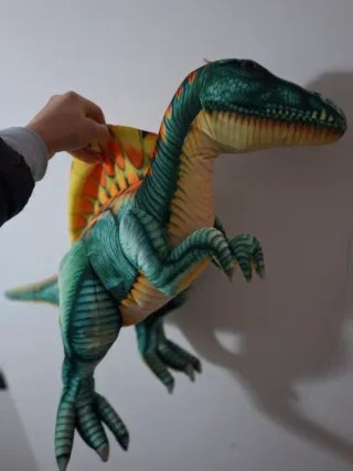 Peluche de dinosaurio con forma de Espinosaurio. Tiene un diseño detallado con colores vivos. - Colores: verde, naranja y amarillo. - Textura suave y acolchada. En perfecto estado. Materiales de muy buena calidad. Tiene unos 50 cm aprox.