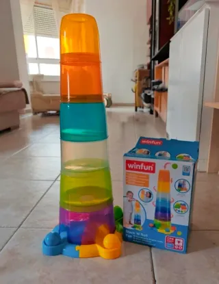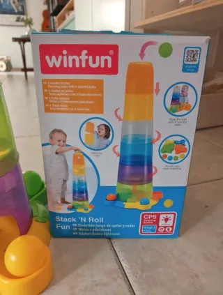 Juego de apilar y tirar bolas de la marca WinFun. - Incluye base, torre y bolas. - Colores vibrantes y divertidos. - Fomenta la motricidad fina.