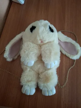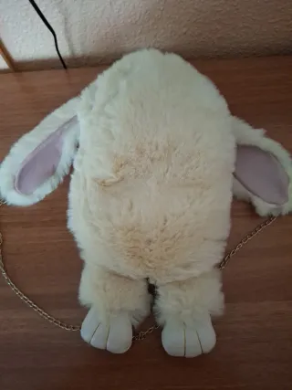 Adorable mochila de peluche con forma de conejo, ideal para los más pequeños. Suave y divertida. - Diseño de conejo. - Material de peluche. - Cadena dorada para colgar.