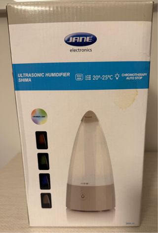 Humidificador ultrasónico Jane Shima, ideal para crear un ambiente agradable. - Tecnología ultrasónica. - Función cromoterapia con luces de colores. - Parada automática de seguridad. - Rango de temperatura de funcionamiento: 20°-25°C.