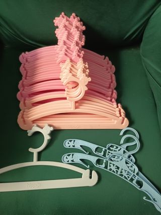 Lote de perchas infantiles de plástico en color rosa. Perfectas para organizar la ropa de los más pequeños. - Diseño con forma de osito. - Material de plástico resistente. - Color rosa. Hay alguna azul . Tengo 23 rosas y 3 azules .