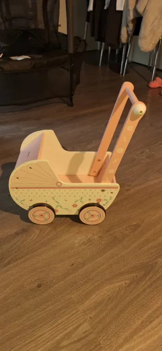 Precioso cochecito de juguete de madera, ideal para las muñecas. - Diseño clásico y encantador. - Pintura rosa y detalles florales. - Ruedas de madera.