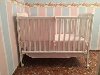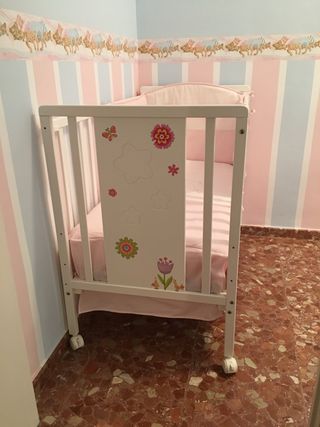 Cuna de madera blanca, ideal para habitaciones infantiles. Cuenta con un diseño tierno y funcional. - Estructura de madera blanca. - Panel decorado con estrellas, mariposas y flores. - Ruedas para facilitar su movilidad. Si no gustan las pegatinas se pueden quitar